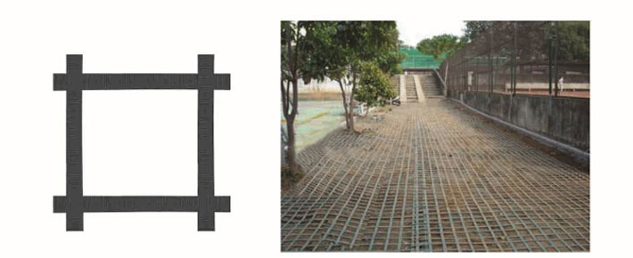 鋼塑復(fù)合土工格柵是用聚丙烯、聚氯乙烯等高分子聚合物經(jīng)熱塑或模壓而成的二維網(wǎng)格狀或具有一定高度的三維立體網(wǎng)格屏柵。由于塑料土工格柵在制造中聚合物的高分子會隨加熱延伸過程而重新排列定向,加強(qiáng)了分子鏈間的聯(lián)結(jié)力,達(dá)到了提高其強(qiáng)度的目的。其延伸率只有原板材的10%~15%。如果在土工格柵中加入炭黑等抗老化材料,可使其具有較好的耐酸、耐堿、耐腐蝕和抗老化等耐久性能。